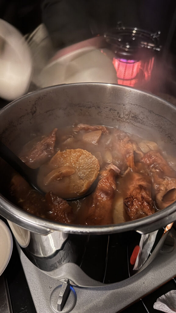 今回の一番の驚きのキャンプ飯は建佑君が作ってくれた味噌おでんです。前回のキャンプで4時間ほど煮込んでもあまりみそ味が具材に染みなかったのが今回は圧力鍋で4時間近くかけて作った味噌おでんは秀逸でした。2~3日煮込んだおでんのようでした。角煮、大根は絶品でした。あまりの美味しさに食べ過ぎてお酒を飲めなくなってしまいました。