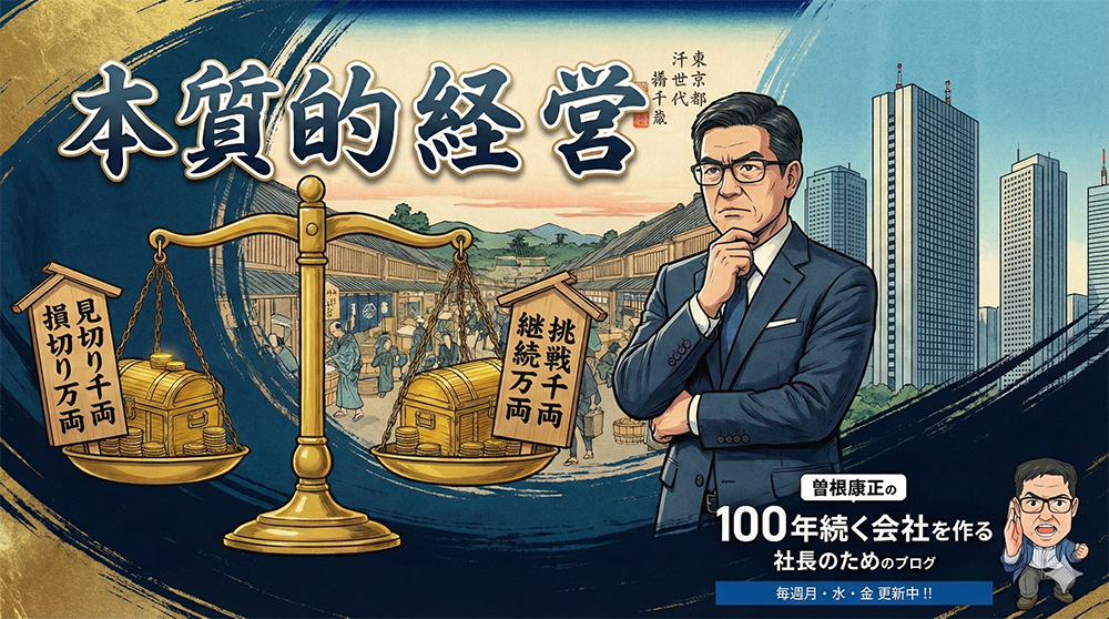 私の経験でも本当にこのことを感じてきました。事業で利益が出ていてガンガン攻めていくことはそんなに難しくありません。一方、事業が上手くいかず赤字が続くあるいは資金を垂れ流しているような状態で事業に見切りをつける、つまり撤退する意思決定をすることは難しい。この意思決定には千両の価値がある。撤退の意思決定をする時に多額の損が出ることを覚悟することは更に難しいというもの。これの多額の損を確定させる覚悟が万両の価値があるというものです。これが出来ずにずるずる事業を継続して潰れていった会社を何社も見てきました。現在進行形の会社もあります。