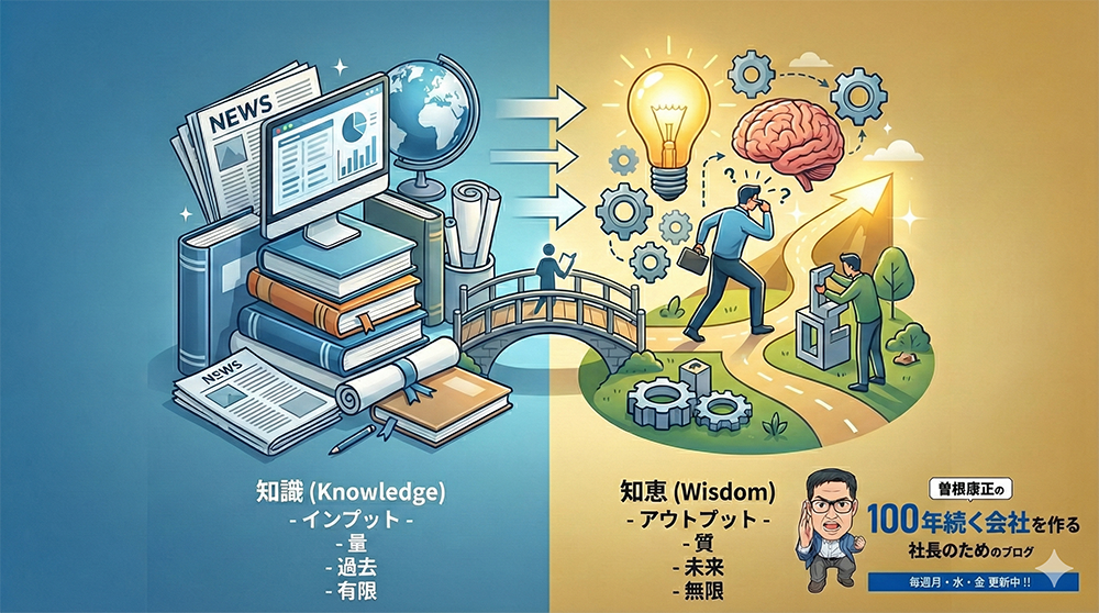 さて、このように見てくると「知識」は頭の中にあるもので過去に基づいて構成されています。そして、重要なのは知識は量です。一方、「知恵」は「知識」に基づいて行動に移すことと言っても良いかもしれません。「知恵」は将来に向かって使うもので重要なのは量ではなく質です。そして、「知恵」は身につけてしまえば自分だけのものであり自分にしかない差別化された能力となります。「知識」は外部から手に入れるものなので手に入れようと思えば自分だけではなく他人でも手に入れられるので差別化は難しいと言えるでしょう。