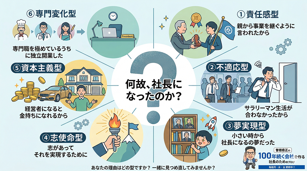 さて、どんな理由であろうが社長になってしまった事実は変わりません。そして、一旦社長になったからには100年続く会社を目指して欲しいものです。次回はどの型が100年続く会社に近いかを分析しますね。
