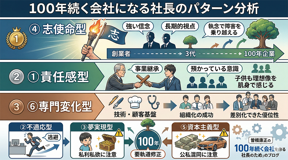 さて、②の不適応型は逃避が要因であるため、③の夢実現型・⑤の資本主義型は成功すると私利私欲に走ったり公私混同しやすいので100年続く会社になるためには社長になるパターンの要因を大きく軌道修正しなければ難しいでしょう。