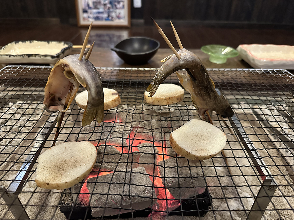 先日釣った渓流魚22センチのイワナを強運庵の囲炉裏で塩焼きにしています。炭で焼いたイワナやアマゴは最高です。イワナの下にある白い丸いものは何と長芋の輪切りです。意外や意外、長芋は擦ったりして食べるのではなく、輪切りにして塩コショウで焼いて食べると最高ですよ!!シコシコの触感と少し焦げたところが香ばしくて美味しい!一度、試してみてください。